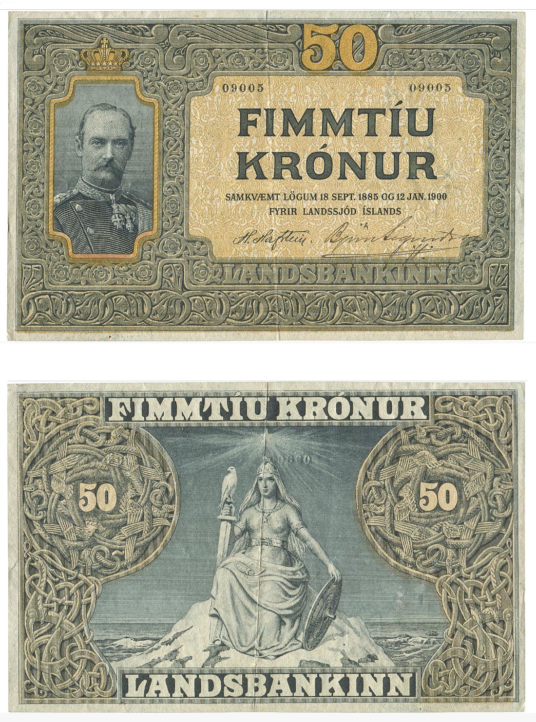| 11 | 50 Krónur | 1885/1900 | Frederik 8. en face | Fjallkonan | Grågrøn/Brun | 147 x 95 |