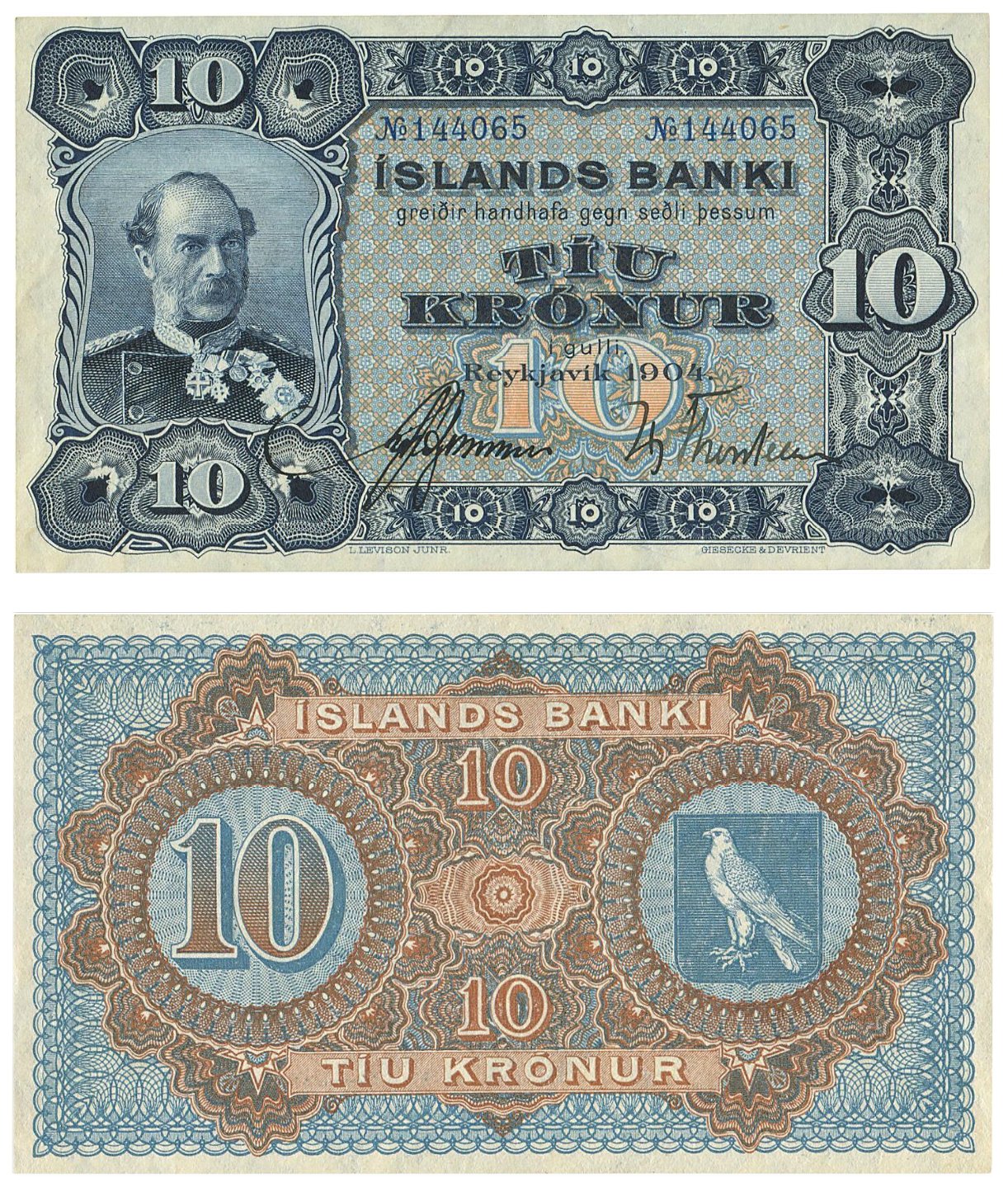 | 16 | 10 Krónur | 1904 | Christian 9. en face | 10 og Falk i rosetter | Mørkeblå/Gråblå, Blå/Rødbrun | 123 x 70 |