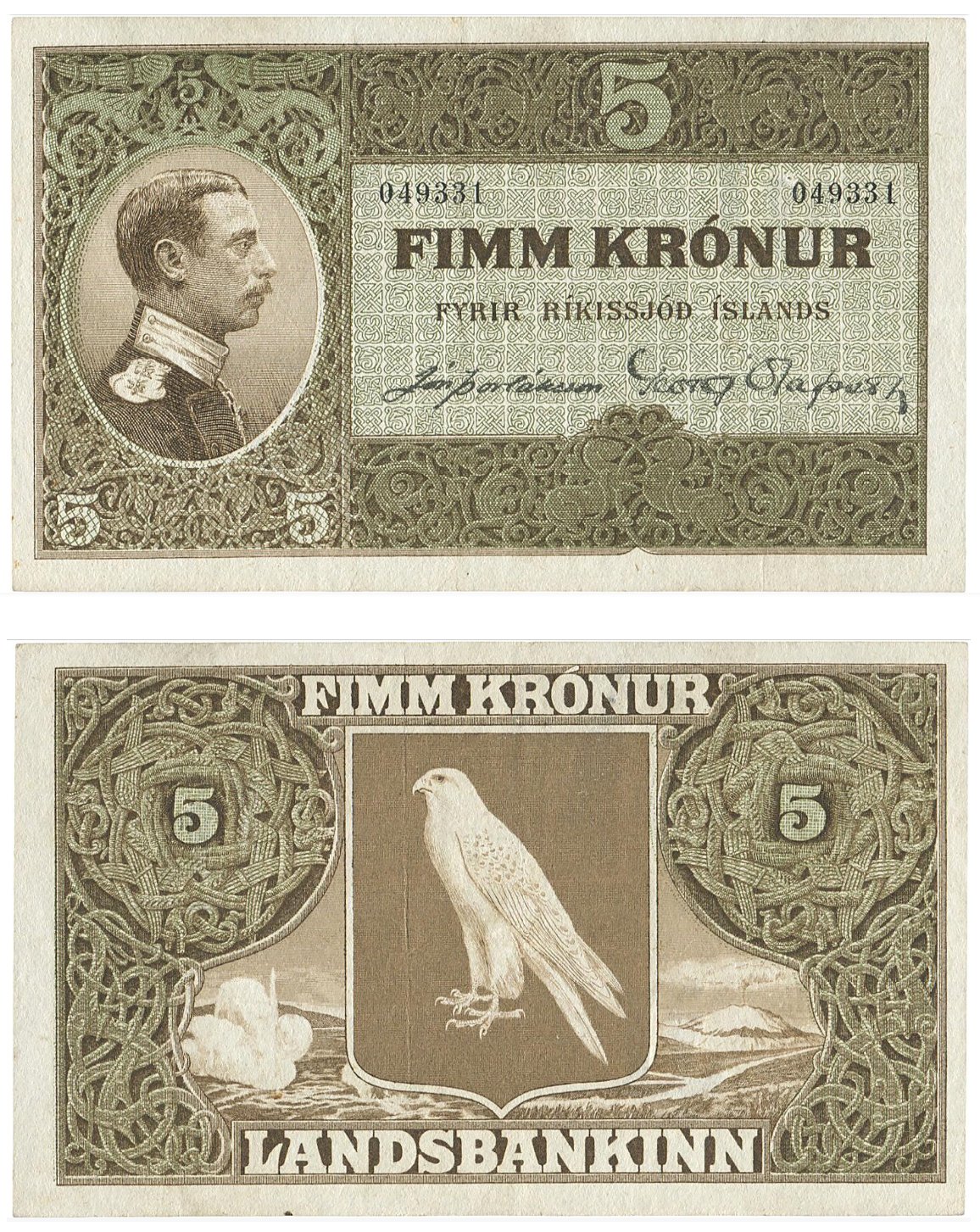 | 22 | 5 Krónur | 1925 | Christian 10. i profil | Islandske falk | Brun/Grøn | 120 x 70 |
