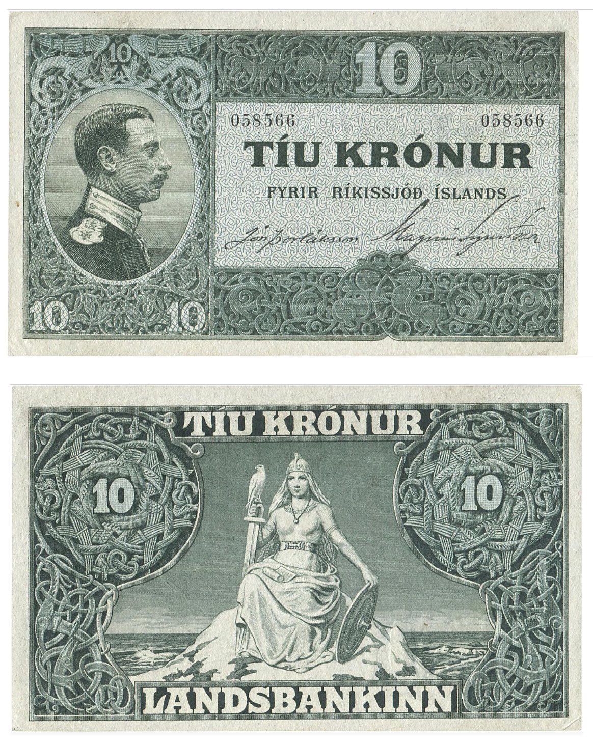 | 23 | 10 Krónur | 1925 | Christian 10. i profil | Fjallkonan | Mørkegrøn/Grøn | 120 x 70 |
