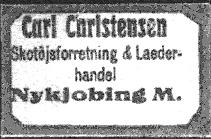 Carl Christensen Skotöjsforretning & Laeder- handel Nykjobing M. blåt gummistempel på orange karton.