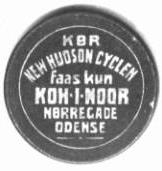 KØR NEW HUDSON CYCLEN faas kun KOH·I·NOOR NØRREGADE ODENSE Rød prægetrykt oblat på dansk 5 øre (Christian IX) (OA fra Numis, Vejle 3-1993 # 191) Forretningen Kooh-i-Noor flyttede senere end 1908 og før 1910 fra Vestergade 96 til Nørregade 14 i Odense, hvor man fik telefon Odense 374. Indehaveren hed Chr. Hansen. |