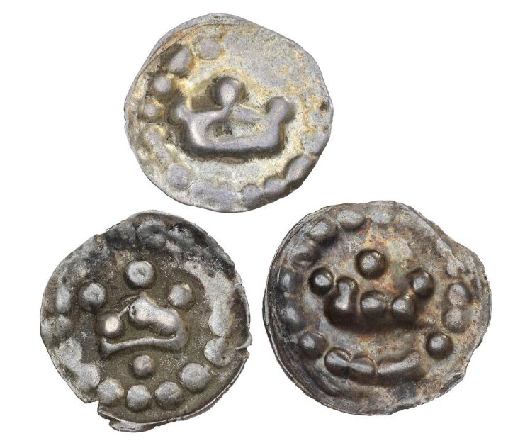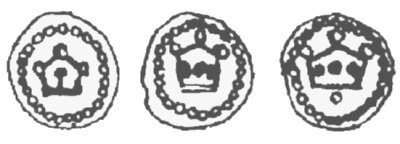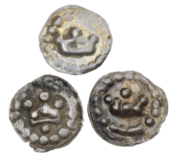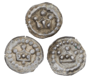 De med kongekroner, må være kongelige udmøntninger. De to første mønter daterer man til ca. 1220.