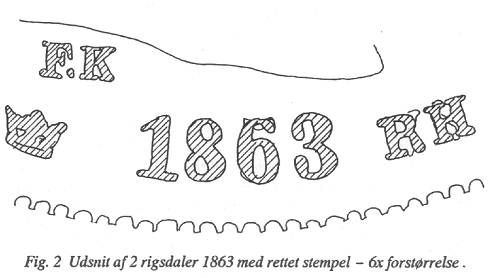 Listen over genanvendte stempler er lang, men her skal omtales et spændende stykke der tidligere har været nævnt i en kort notits i Møntstuens salgsliste nr. 9, marts 1978 (1), men antagelig er ukendt for de fleste møntsamlere. Det drejer sig om en 2 Rigsdaler 1863 (H: 6C) fig. 1 (2), hvor stemplet, der oprindeligt har været signeret af møntmester Georg Wilhelm Svendsen (VS) (3) er blevet anvendt af hans efterfølger i embedet Peter Rasmus Hinnerup (RH) (4). Stemplet er rettet som vist i fig. 2, ved at der er indslået et 6-tal oven i 5-tallet og oveni møntmesterens initialer VS er indslået RH. Hvorledes stemplet oprindelig har været anvendt, kan ikke siges med sikkerhed, da der kan være flere mulige forklaringer.