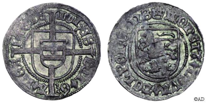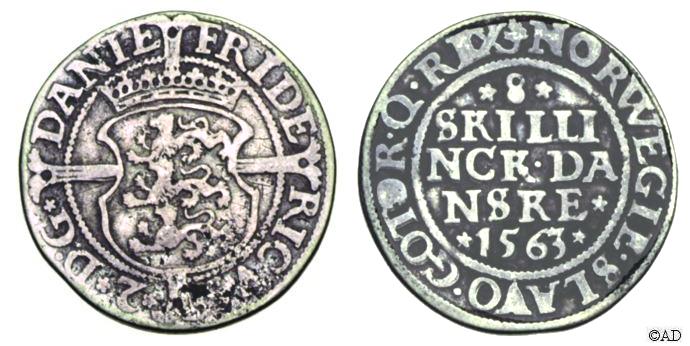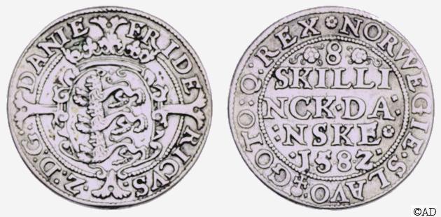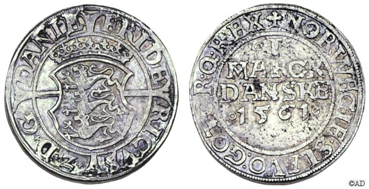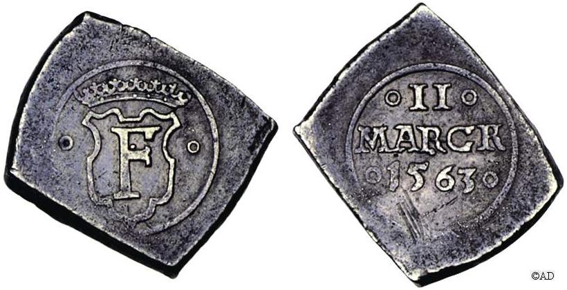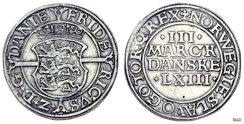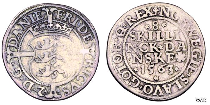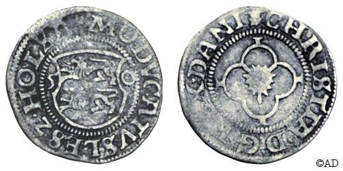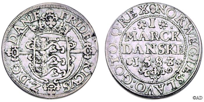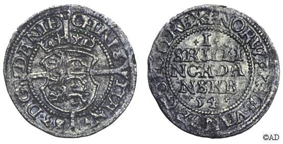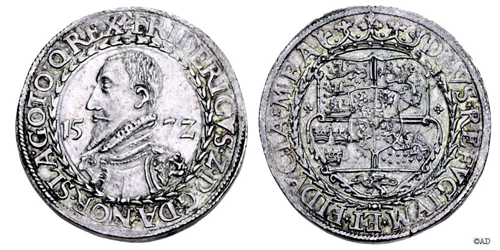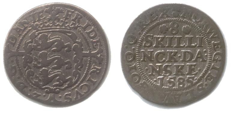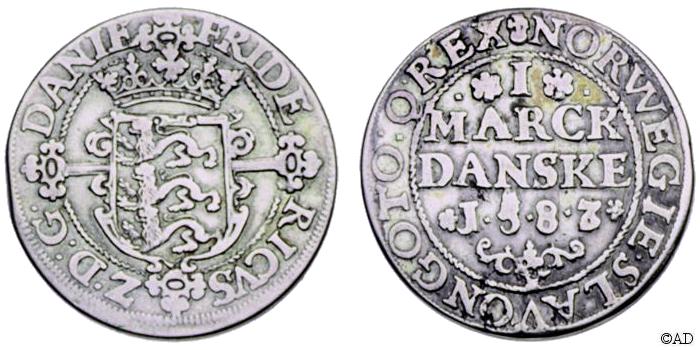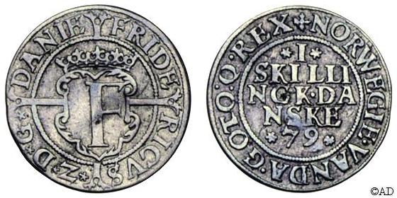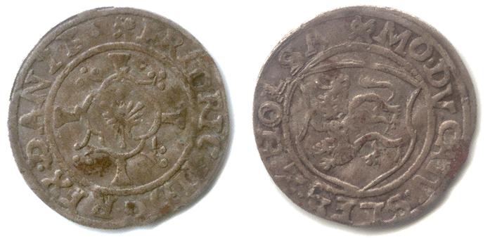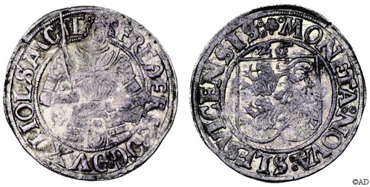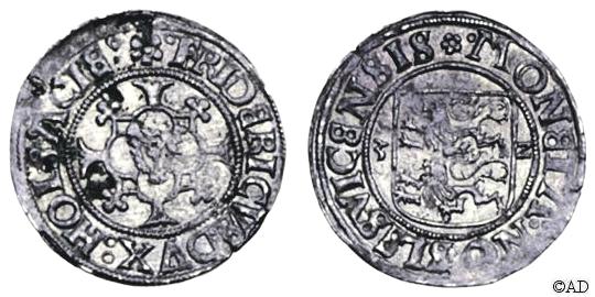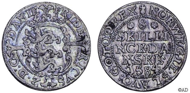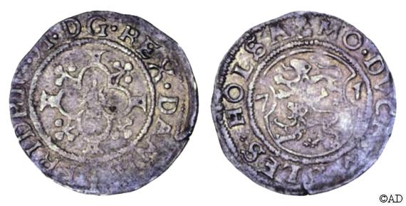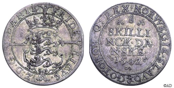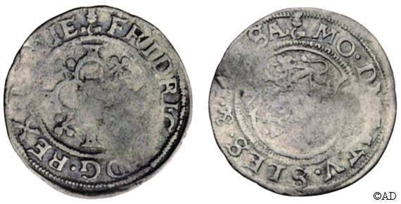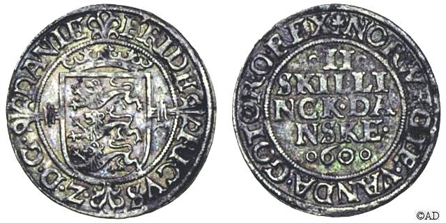Illustrationen viser auktionens nummer 711, Frederik 2's 1 skilling lybsk u. år, Flensborg (Hede 30A, Schou 7).