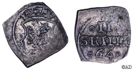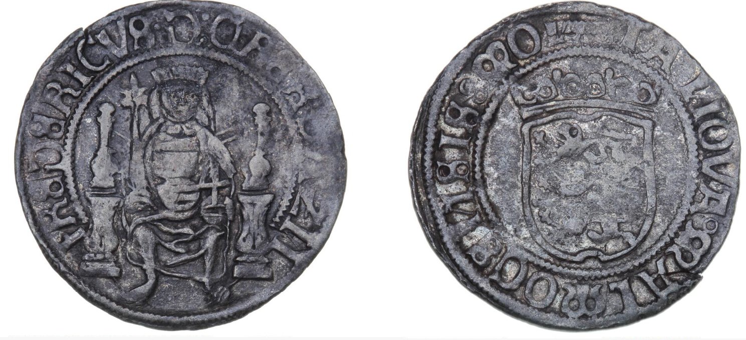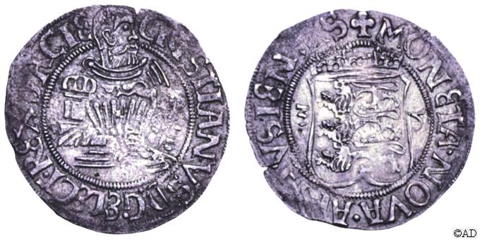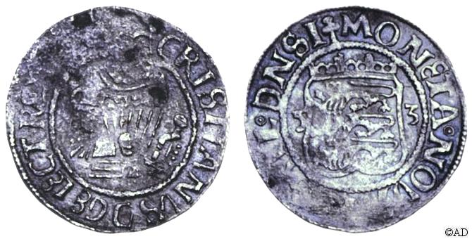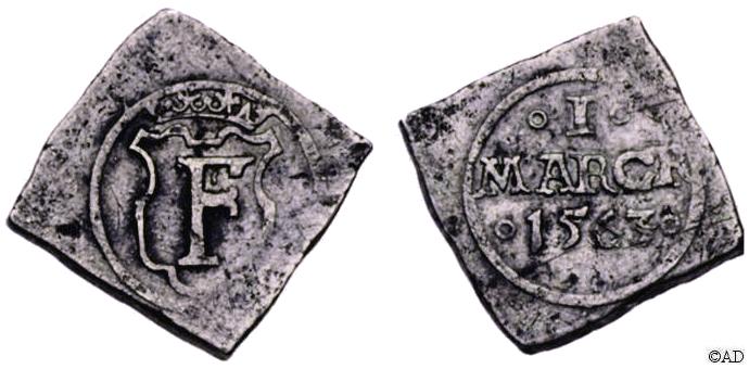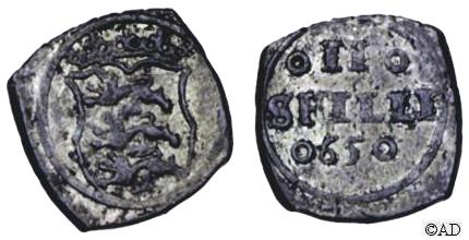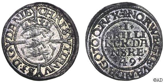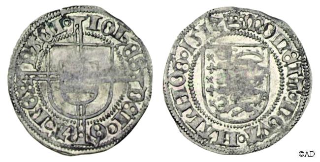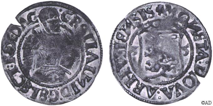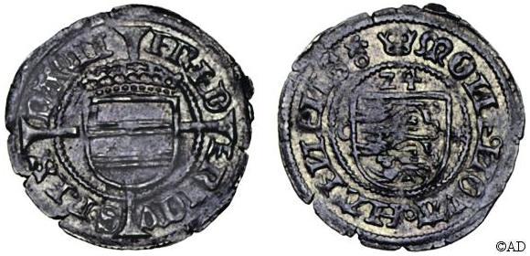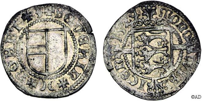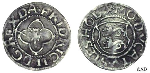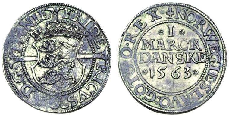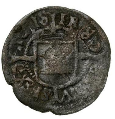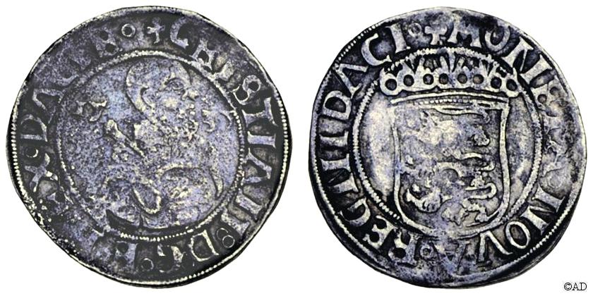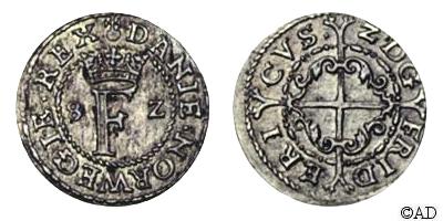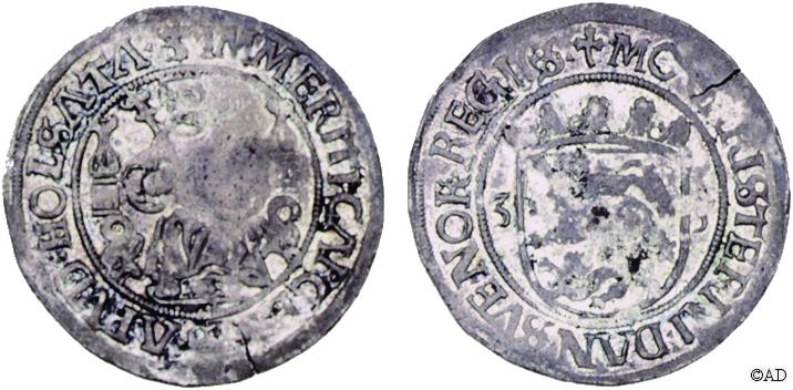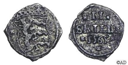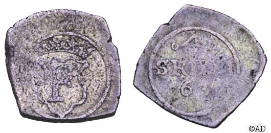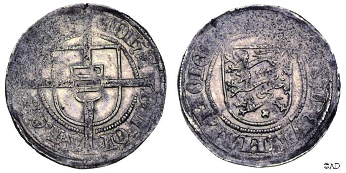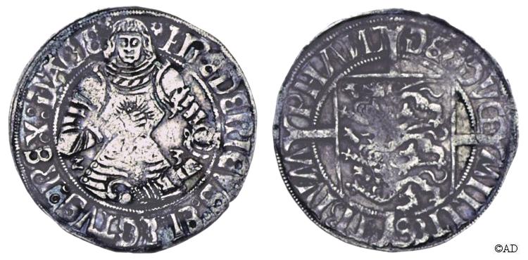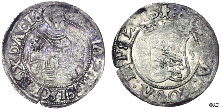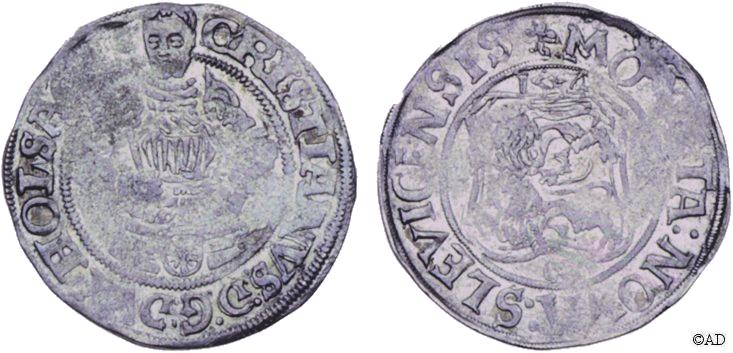 Illustrationen viser auktionens nummer 711, Frederik 2's 1 skilling lybsk u. år, Flensborg (Hede 30A, Schou 7).