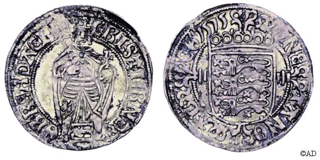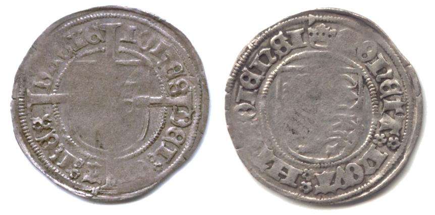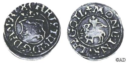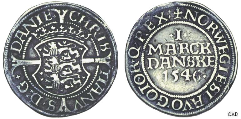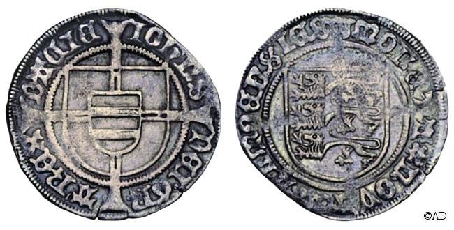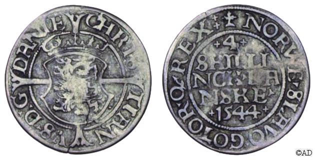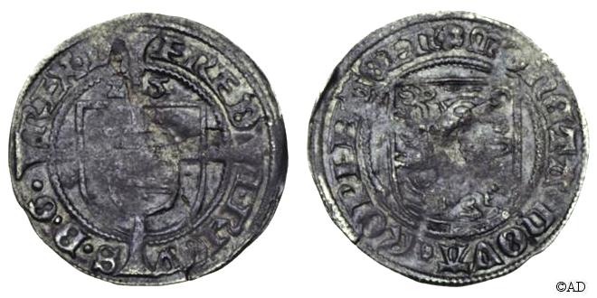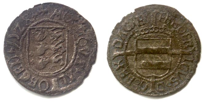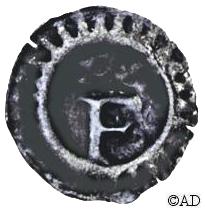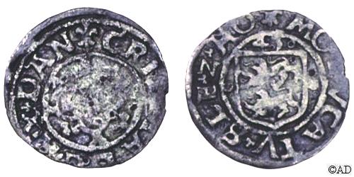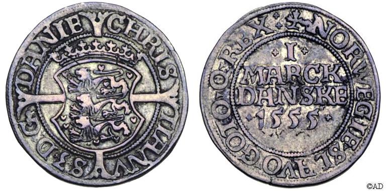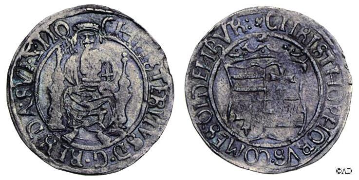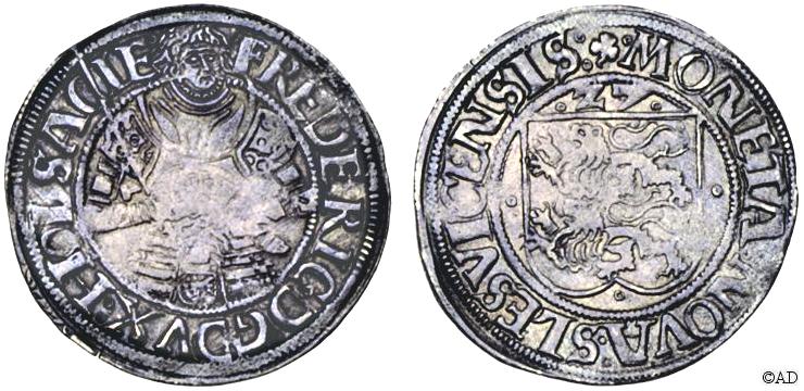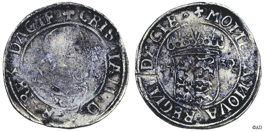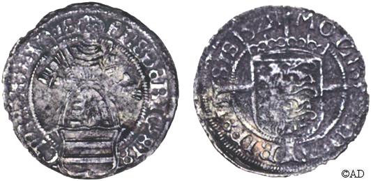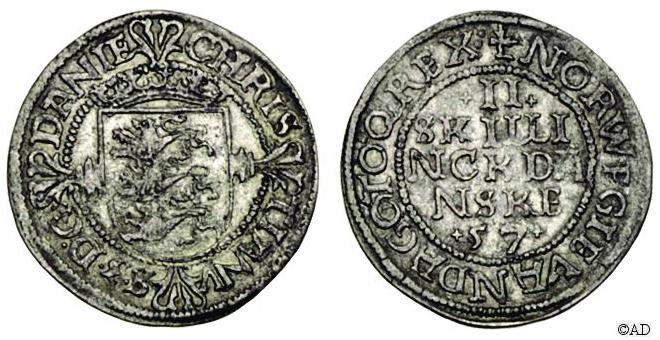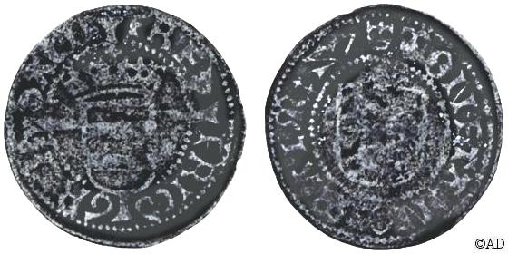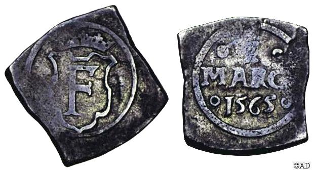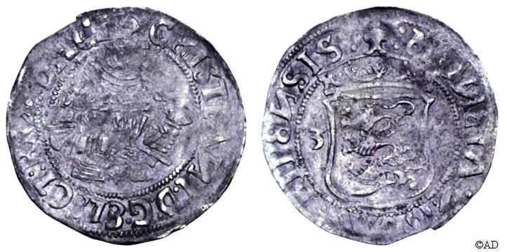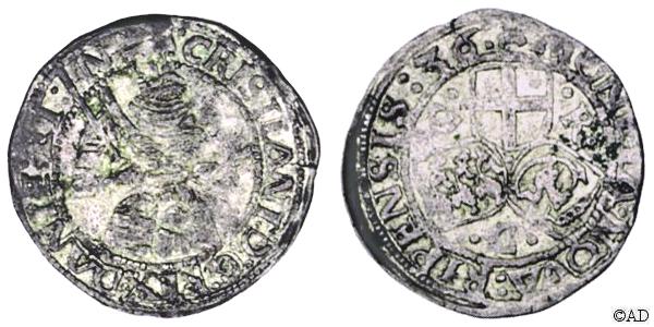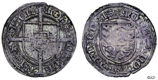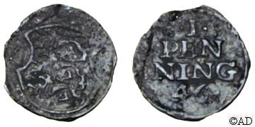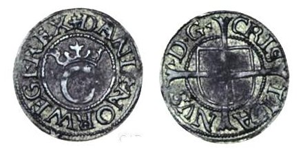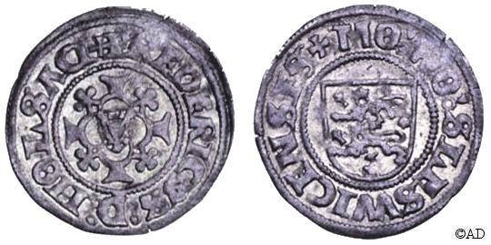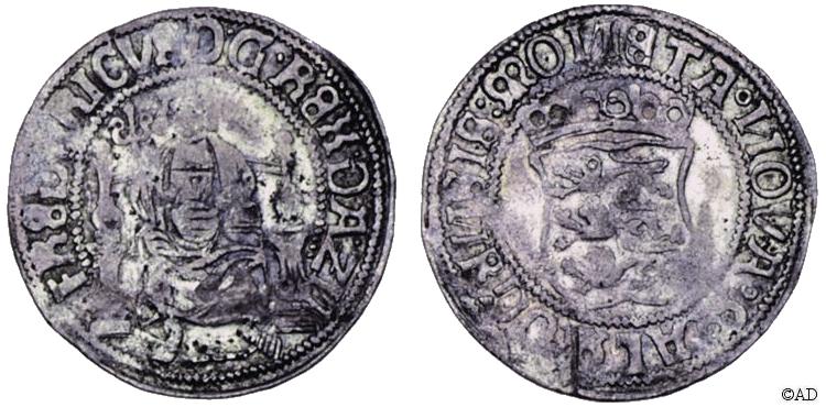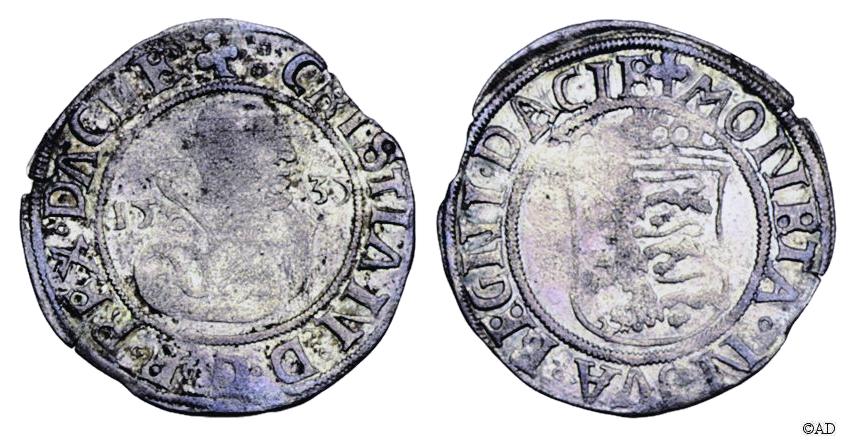 Illustrationen viser auktionens nummer 711, Frederik 2's 1 skilling lybsk u. år, Flensborg (Hede 30A, Schou 7).