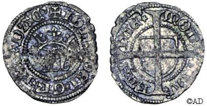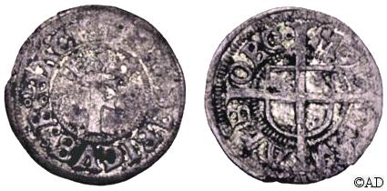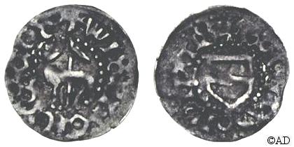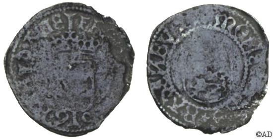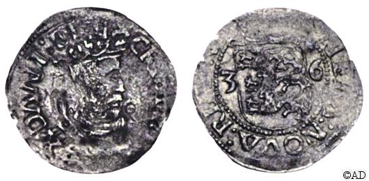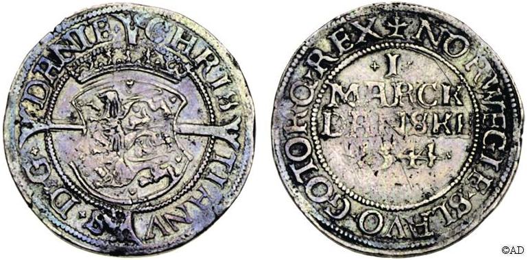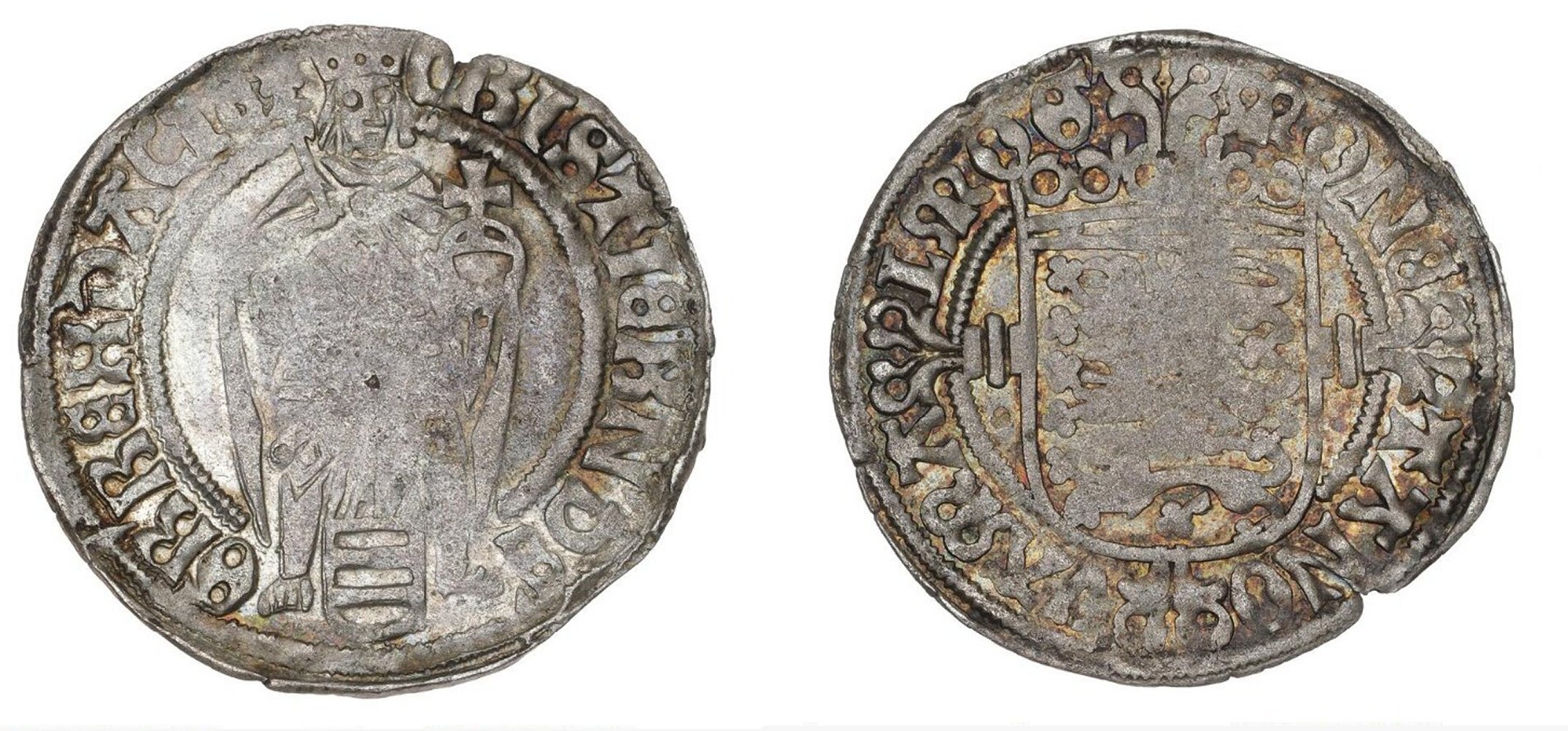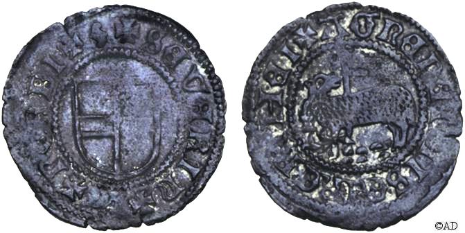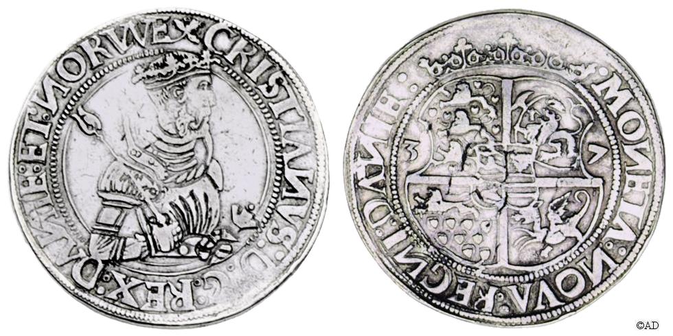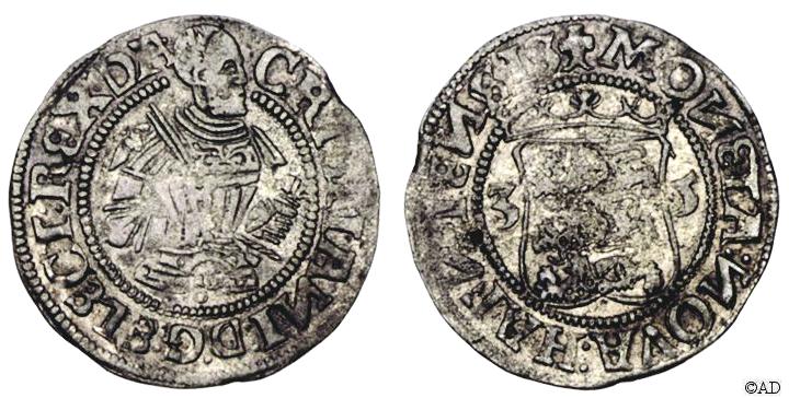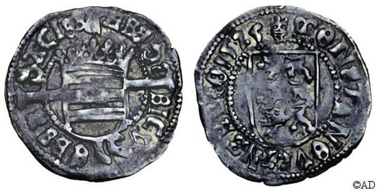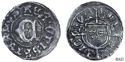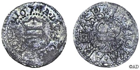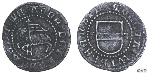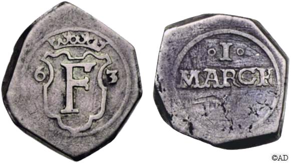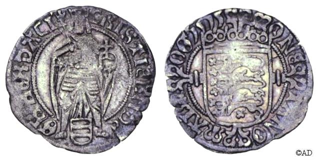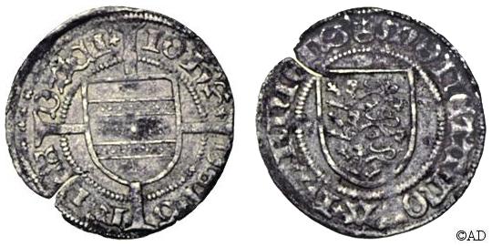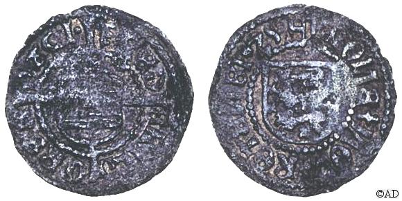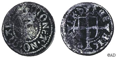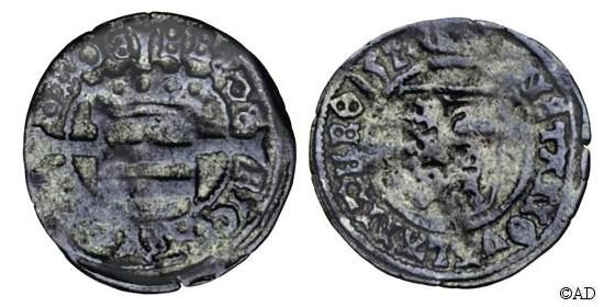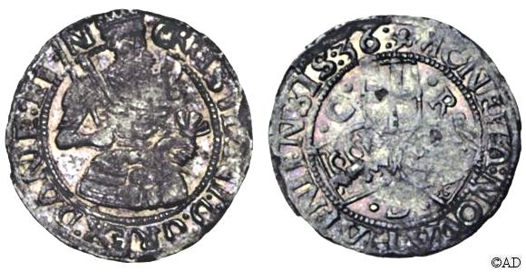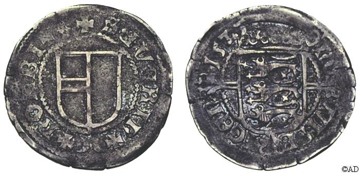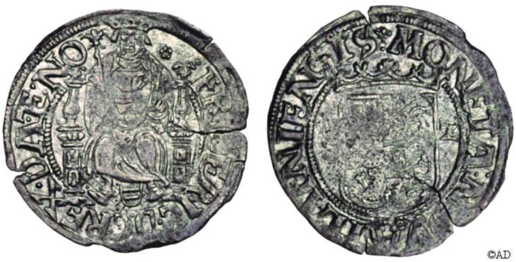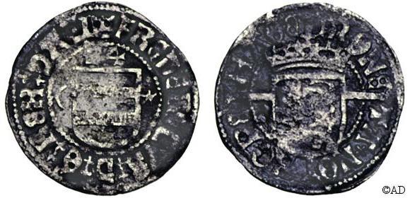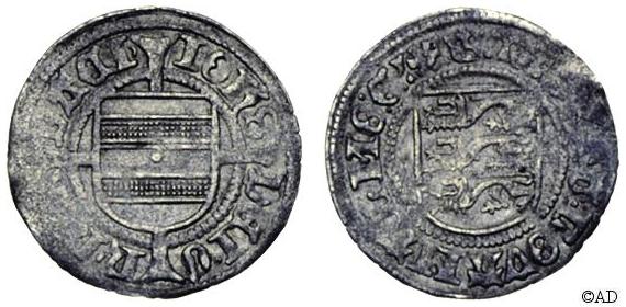 Illustrationen viser auktionens nummer 711, Frederik 2's 1 skilling lybsk u. år, Flensborg (Hede 30A, Schou 7).