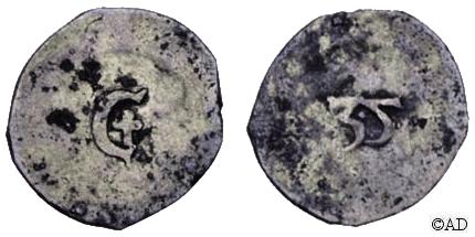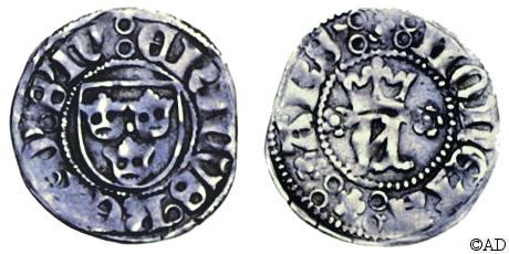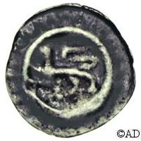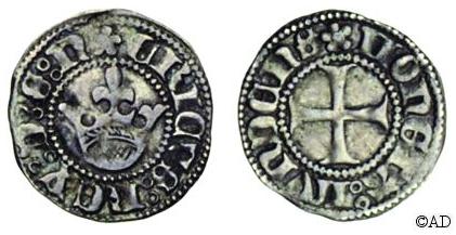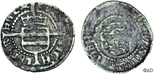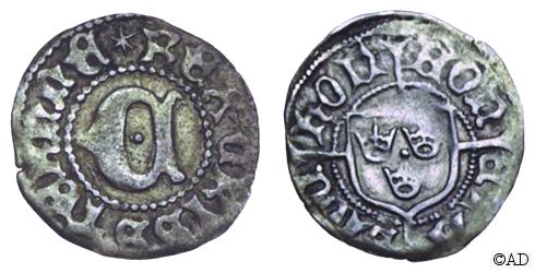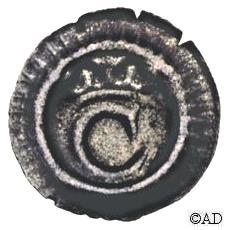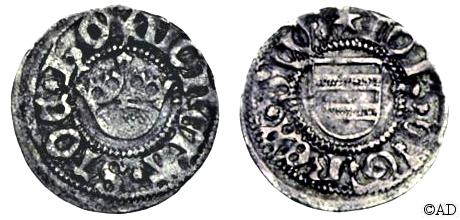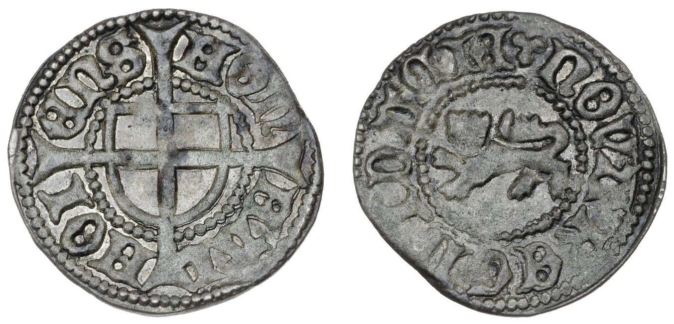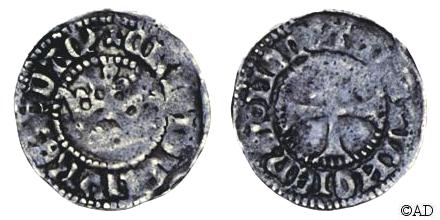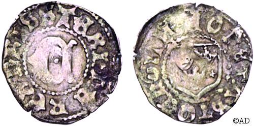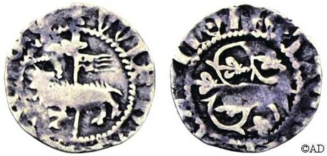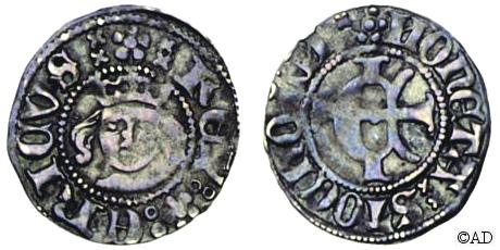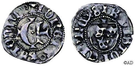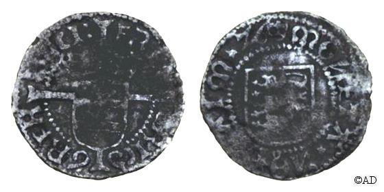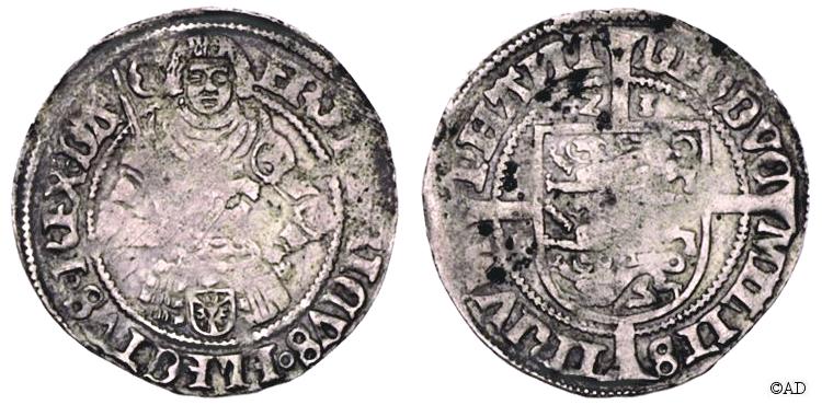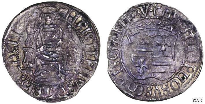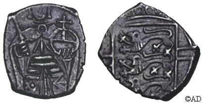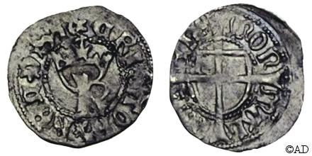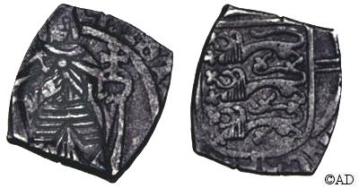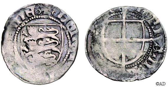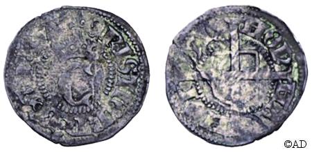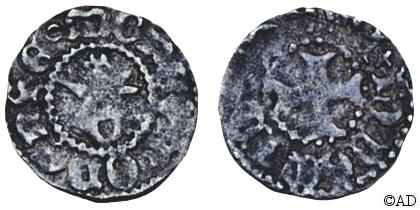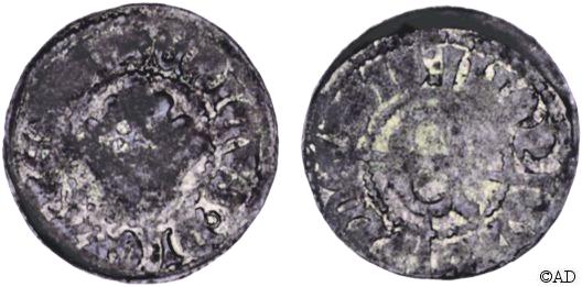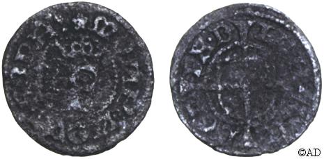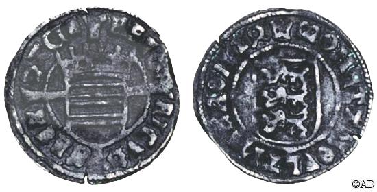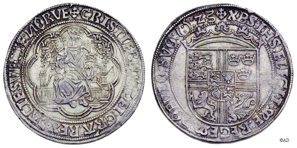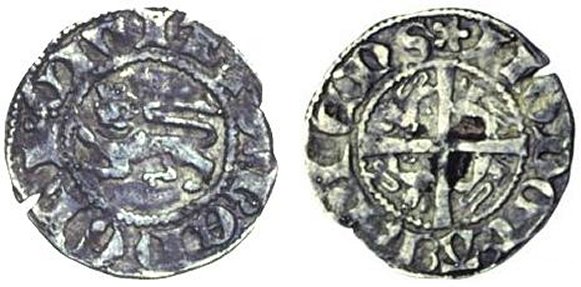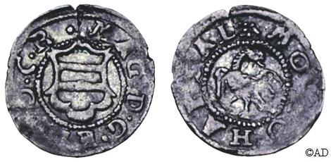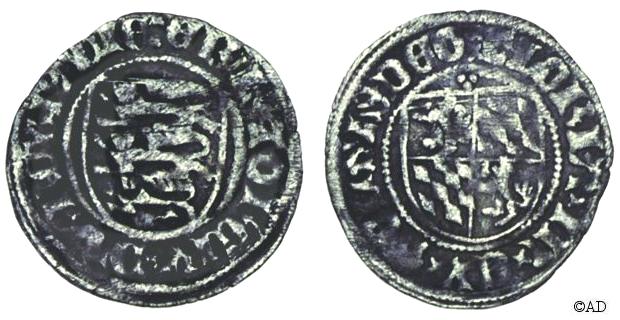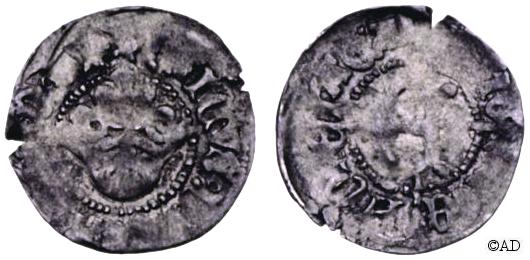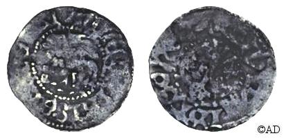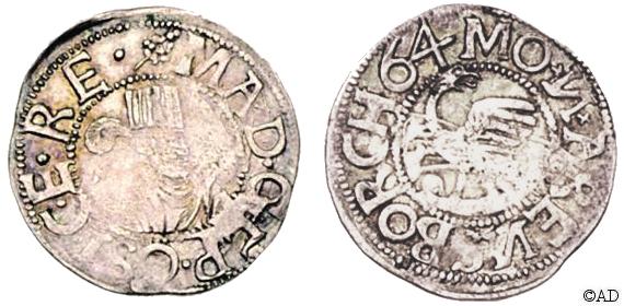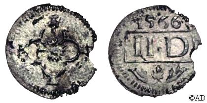 Illustrationen viser auktionens nummer 711, Frederik 2's 1 skilling lybsk u. år, Flensborg (Hede 30A, Schou 7).