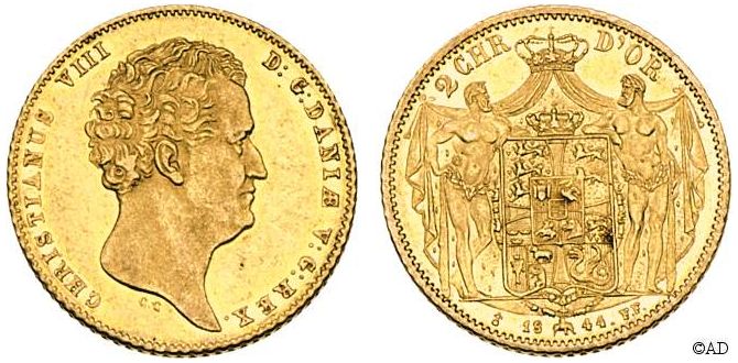 - C) 1844 (S), København: møntmærke krone, bagside: VS (Hede 1C, Schou 2, Sieg 16.3)