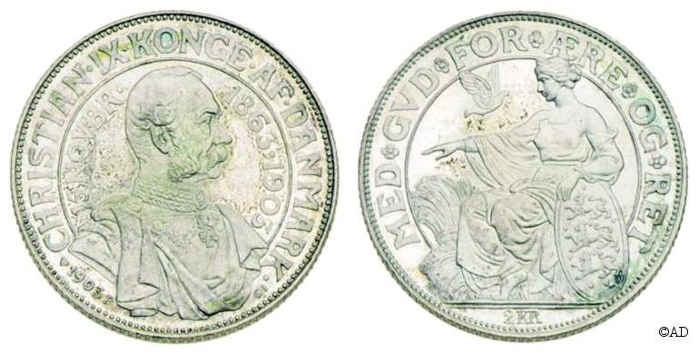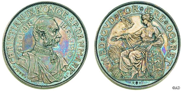 I anledning af kongens 40 års regeringsjubilæum søndag den 15. november 1903. På et første udkast mangler duen, som flyver ud for Mor Danmarks ansigt på møntens bagside. Illustreret Tidende kunne fortælle, at der på dagen, søndag morgen udleveredes et begrænset antal. Det var medailløren, Gunnar Jensens første mønt.