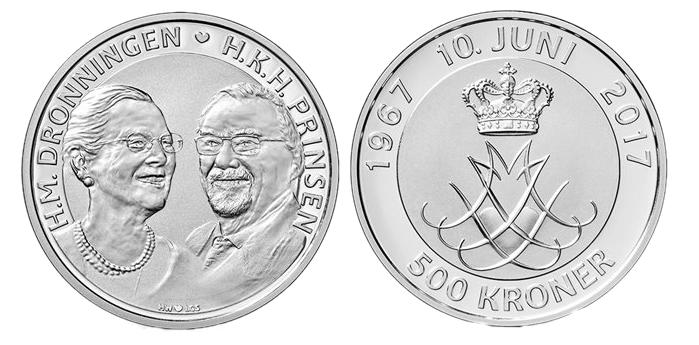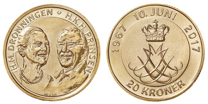 På erindringsmønten er et portræt af regentparret, der viser dronningen og prinsen i trekvart profil vendt mod hinanden. Langs randen er en ring, hvor der står: H.M. Dronningen og H.K.H. Prinsen. Tituleringerne er adskilt af et hjerte, Den Kgl. Mønts mærke. Bagsidemotivet er dronningen og prinsens fælles monogram. Foroven står de to årstal og datoen for guldbrylluppet. Under monogrammet er møntmærkehjertet, der samtidig symboliserer kærligheden. Medaljør Henrik Wiberg har udført portrættet og gengivet fællesmonogrammet.