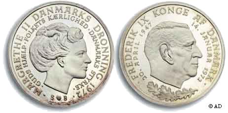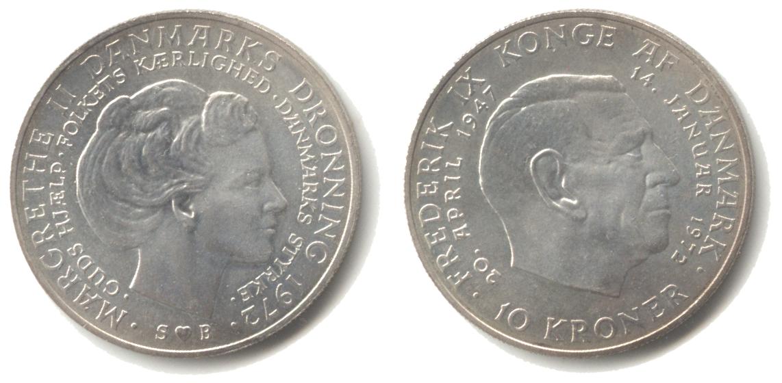 Erindringsmønt i anledning af tronskiftet. Oplag 402.902 stk foruden 100 ministereksemplarer uden værdiangivelse. Mønten blev solgt til en overpris af 25 kroner. Salget startede 1. november 1972. Overskuddet skulle anvendes til alment gavnlige formål.