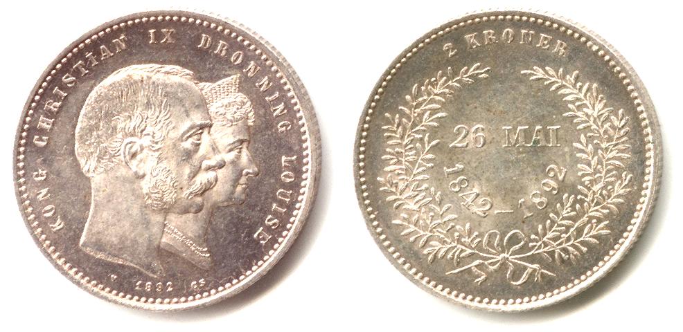 Dronning Louise optræder på 2-kronen i anledning af parrets guldbryllup, som det fremgår af bagsideindskriften : 26. MAI 1842-1892.