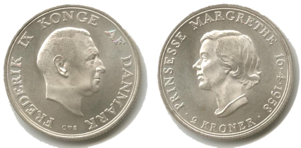 I 1958 fyldte Frederik 9.s ældste datter, Margrethe, 18 år. Siden grundlovsændringen i 1953 havde hun været tronfølger og blev som sådan myndig som 18-årig - myndighedsalderen var ellers 21 år - og blev optaget i Statsrådet. Begivenheden mindedes med en 2-krone.