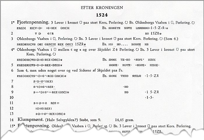 Eksempel på systematikken i H. H. Schous værk - et uddrag af oversigten over Frederik I's udmøntninger fra 1524