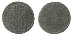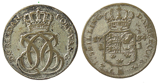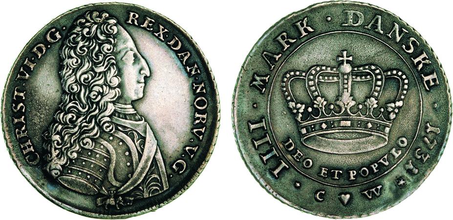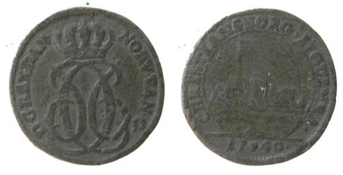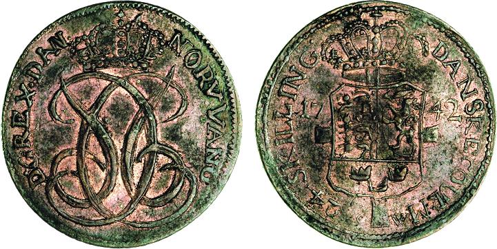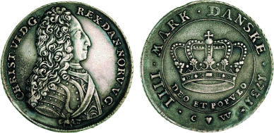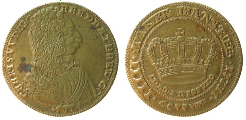 Noget ejendommeligt forsøg på kopiering, men forbilledet må have været Hede 4. Læg mærke til at mange af bogstaver og tal i omskrifterne doblet samt kongens meget forandrede ansigt - antagelig dobbeltslag. Messing (BPs samling)