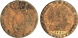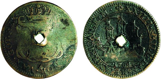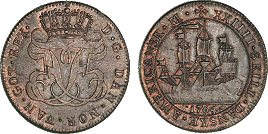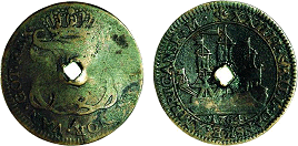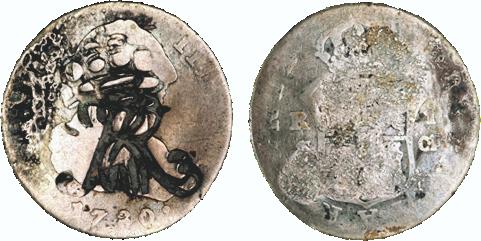 Ægte spansk mønt med falsk kontramærke - læs her. (Lerches samling)