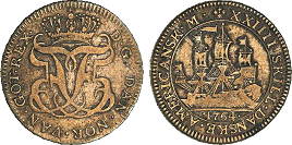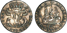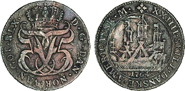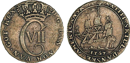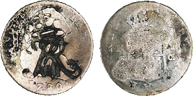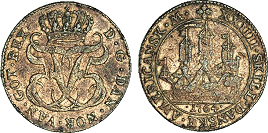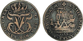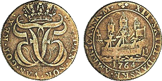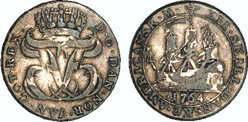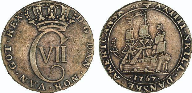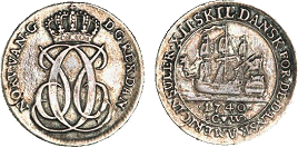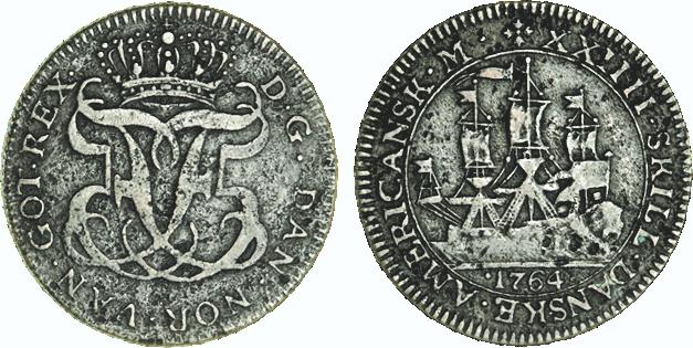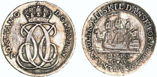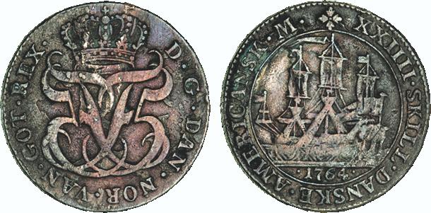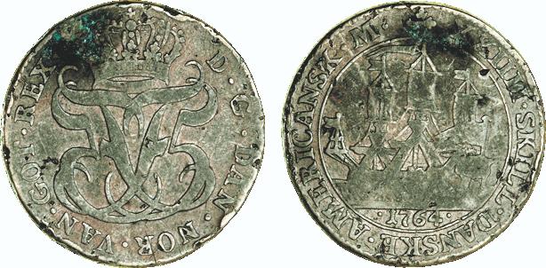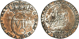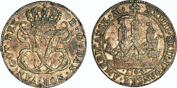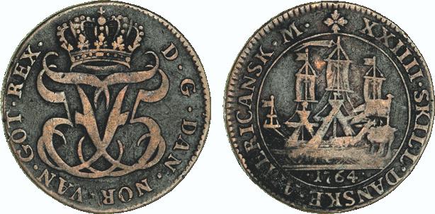 Hede 7. Samme forfalskningstype som ovenstående Frederik V mønter. (Lerches samling)