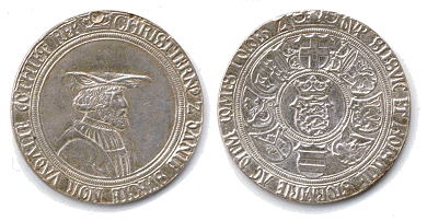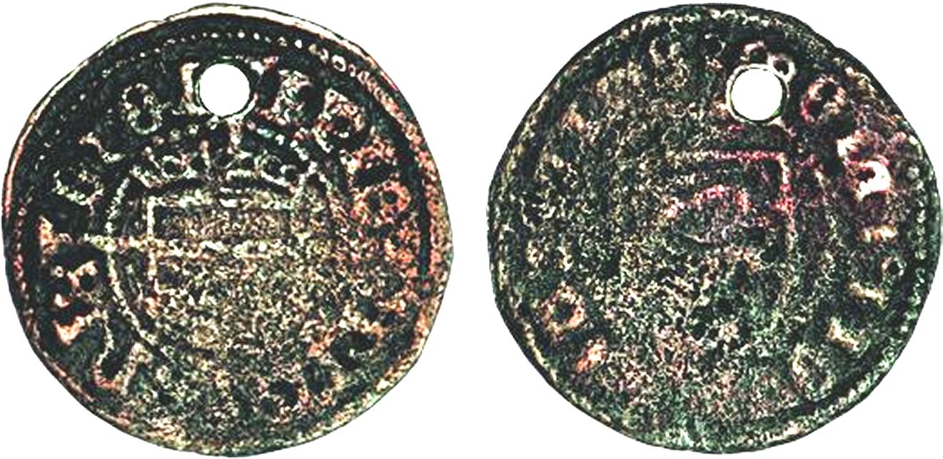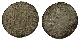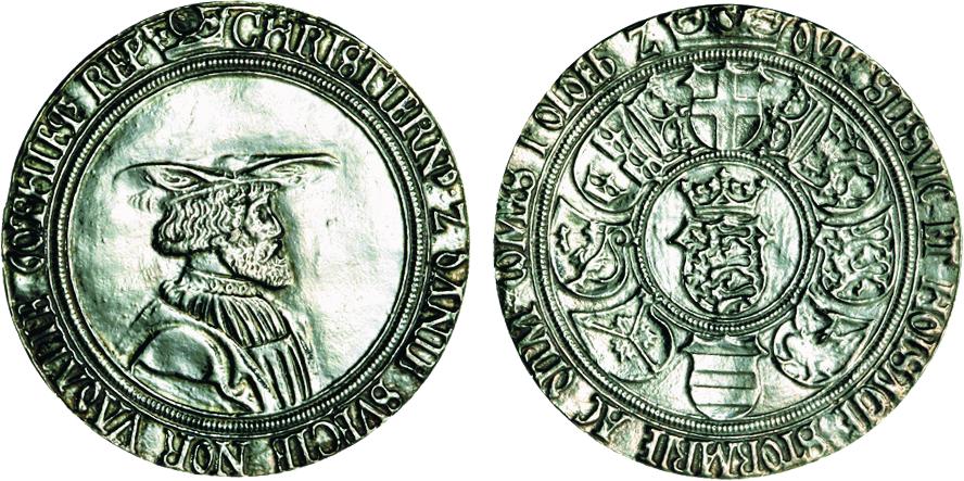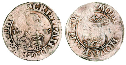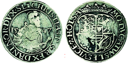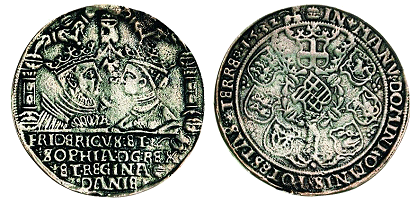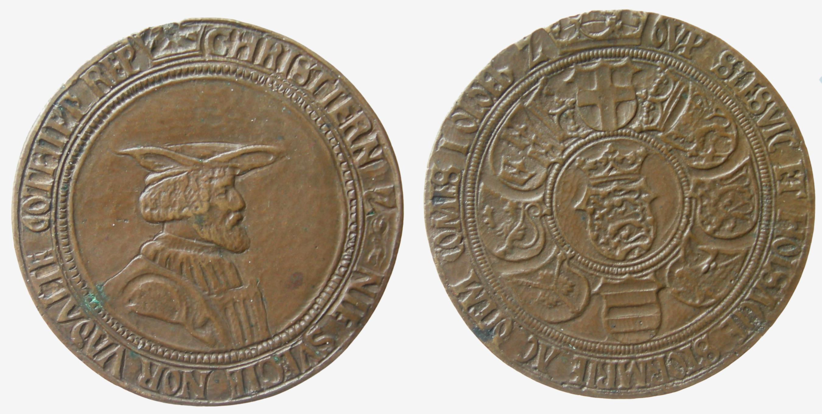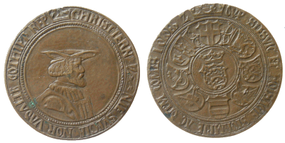Galster 44. Til venstre kopi i sterlingsølv (J. Sømod ca. 1970) af mønt/medaille fra Bibliothéque Nationale i Paris, hvor den dog ikke kan findes frem idag. (Lerches samling) til højre kobberafstøbning (B.P. samling)