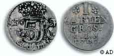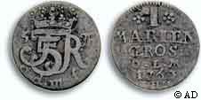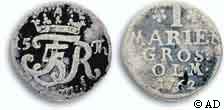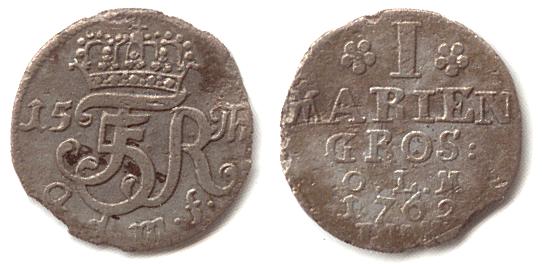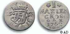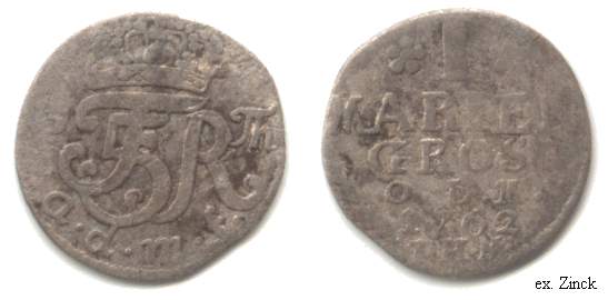 - C) 1762; IHM; Værdien angivet som GROSCH (Hede 11B, Schou 39, Sieg 49.3)