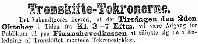 I anledning af tronskiftet. Christian IX døde den 29. januar 1906. Møntens udprægning og udseende blev meddelt ved Bekendtgørelse nr. 223 af 12. september 1906 efter at kongen den 9. april samme år havde bifaldet, at der skulle præges en sådan mønt. 13. september 1906 lod Nationalkomiteen indrykke annoncer, der meddelte, at forudtegning af tronskifte-tokroner kunne modtages i alle landets banker og sparekasser med filialer. Endelig kunne man den 2. oktober 1906 erhverve mønten, hvortil stemplerne var udført af medaillør Gunnar Jensen.