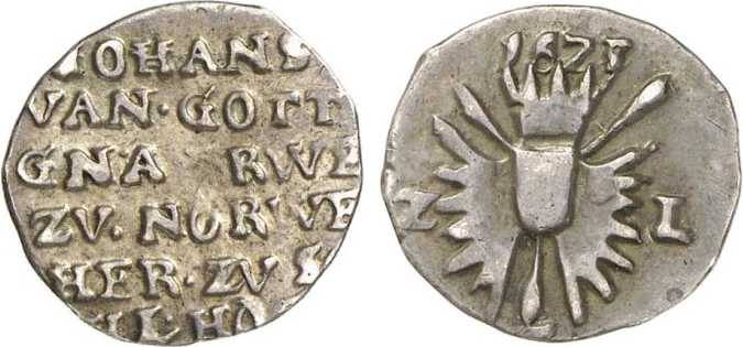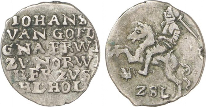 | 1 | 3629 | 1 | 10 | 540ab | 2 skilling lybsk | sølv | u. år | Fs: Rytter mod venstre. Svane under hestens forben; Z S L Bs: IOHANS VAN GOTT GNA ERWA ZV NORWE HER ZV SCHL. HOL. (flere varianter) |