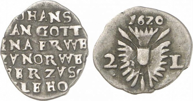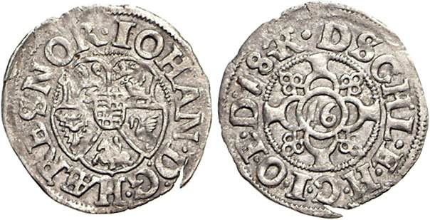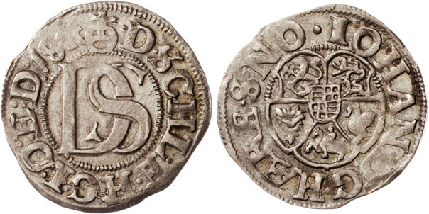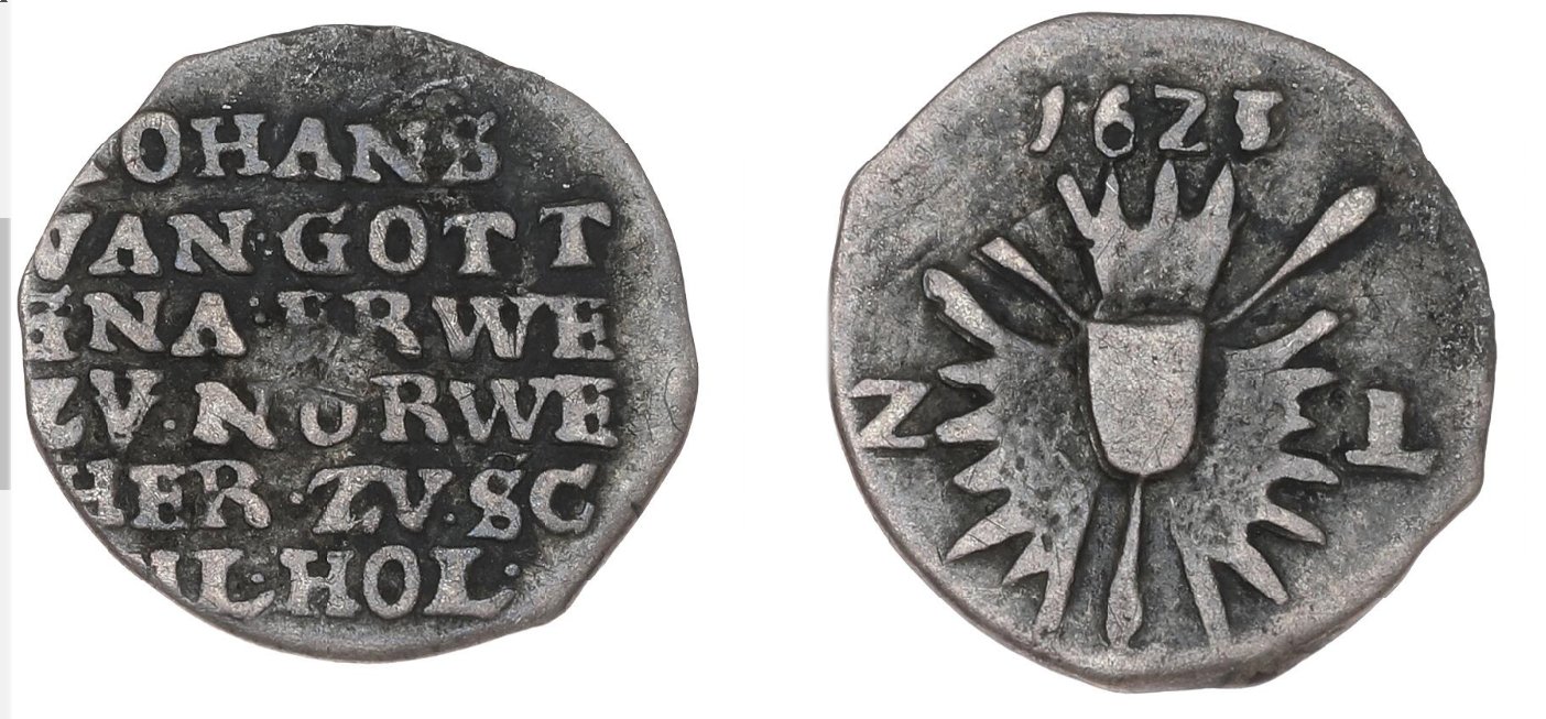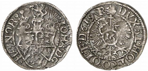 | 17 | 3633 | 18 | 18 | 528 | 2 daler | sølv | 1622 | Fs: IOHANNES D G HÆRES NORWEGIÆ DVX SCHL (portræt) Bs: ET HOLS C I OL E DE 6ZZ (våbenskjold) Præget med samme stempler som mønten ovenfor |
