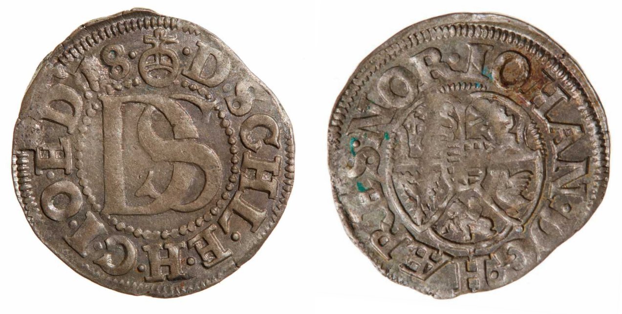 | 12 | 3626 | 12.1-3 | 4 | 536 | Dobbeltskilling (1/16 daler) | sølv | 1619 | Fs: IOHAN D G HÆRES NORW Bs: D SCHL E H C I O E D (DS) (forskellige skjoldtyper) |