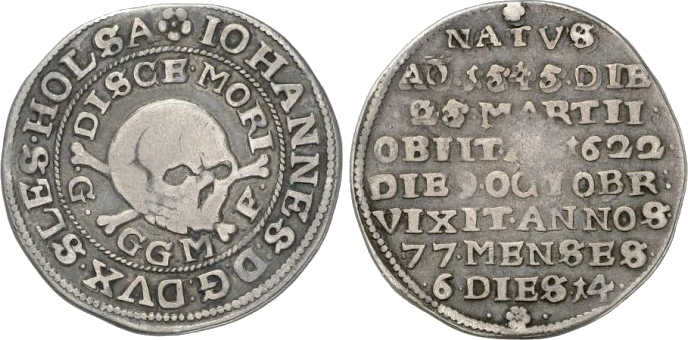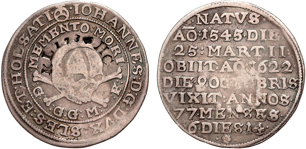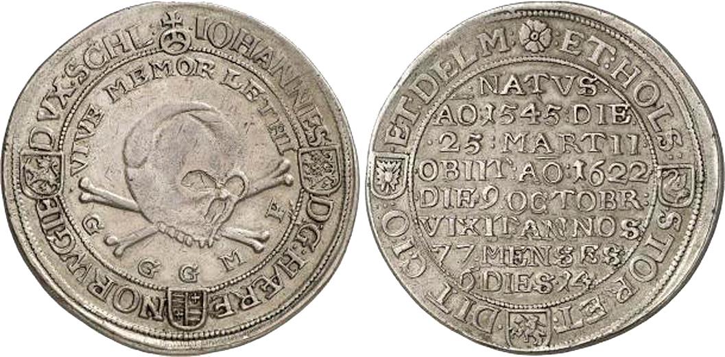 | 19 | 3639 | 14 | 25 | 546 | 1/4 daler | sølv | 1622 | Dødsdaler. Fs: IOHANNES D G DVX SLES HOLSA DISCE MORI (dødningehoved) Bs: NATVS osv...; 8 linier tekst |