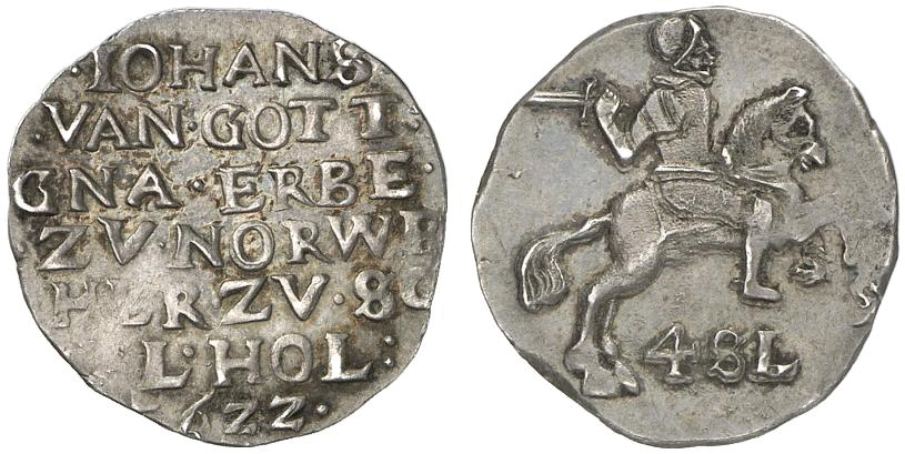 | 3 (a) | - | - | 20 | - | 4 skilling lybsk | sølv | 16ZZ | Fs: Rytter mod højre. Ingen svane under hestens forben; 4 S L Bs: IOHANS VAN GOTT GNA ERBE ZV NORWE HER ZV SCHL. HOL. (flere varianter) |