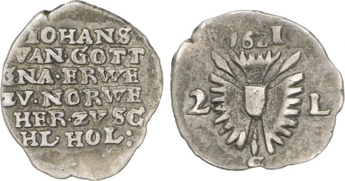 | 18 | 3622 | 19 | 2 | 527 | 1 guldgylden | guld | 1619 | Fs: IOHAN D G HÆRES NOR (portræt) Bs: DVX SCHL E HOL C I O E D 1619 (våbenskjold) |