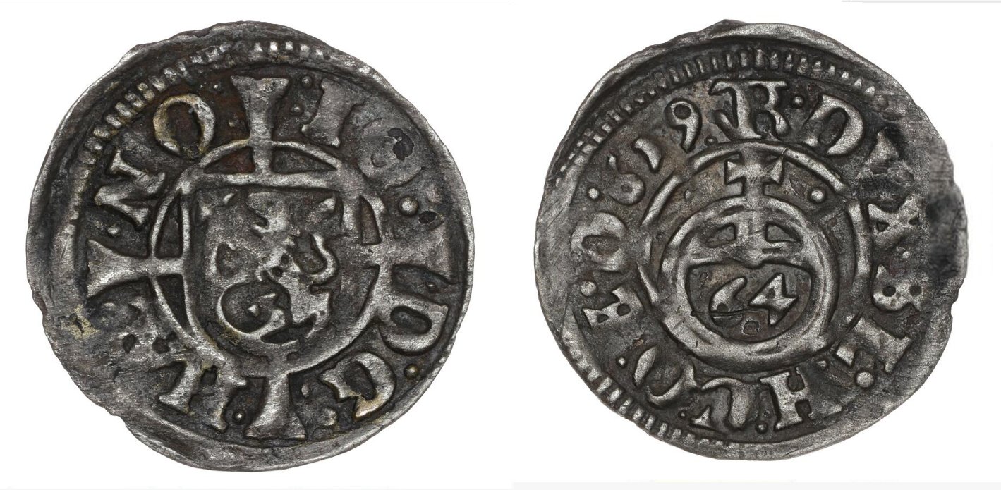 | 7 | 3635 | 8 | 21 | 538 | 1 søsling lybsk (1/96 daler) | sølv | 16ZZ | Fs: IOHANNES D G DVX (rytter) Bs: SLES E HOLS 622 (96) |