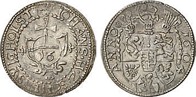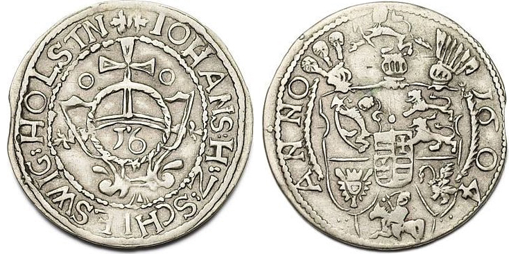 | 8.2 | - | 9 | 1b | - | Dobbeltskilling (1/16 daler) | sølv | 1604 | Fs: IOHANS H Z SCHLESWIG-HOLSTN (16) Bs: ANNO 1604; skjold Uden ringe over forsidens rigsæble |