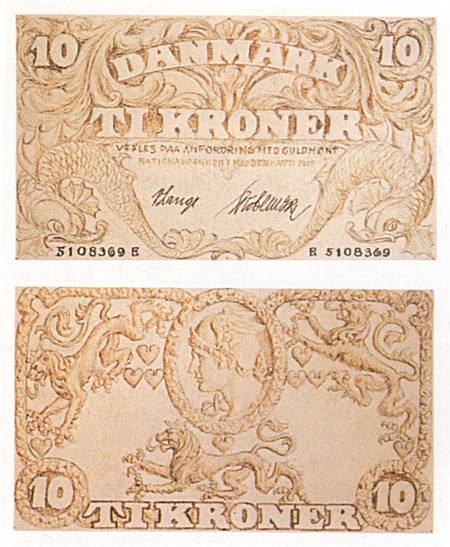I størst oplag kom dog den klassiske tier, der ligesom plovmanden skiftede tekst fra den viste til "Nationalbankens sedler indløses med guld efter gældende lov" i 1930. Nederst vises Heilmanns første udkast til tieren. Der er sket væsentlige ændringer mellem det og det endelige resultat.Heilmanns karakteristiske skønvirkestil - den danske udgave af jugend/art nuoveau - genfindes i nedenstående møntforslag fra 1907. Samtlige Gerhard Heilmanns møntforslag vises i Jørgen Sømod: Mønterne Fortæller, 1977.