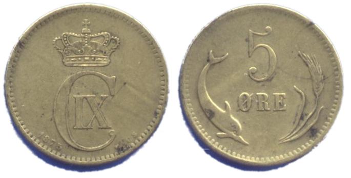Hvem kan fortælle noget om denne messing 5 øre fra 1875 i øverste højre hjørne? Vi kan kun sige at den ikke ser ud til at være støbt, og i det hele taget ægte i den forstand at den er slået med de officielle stempler!