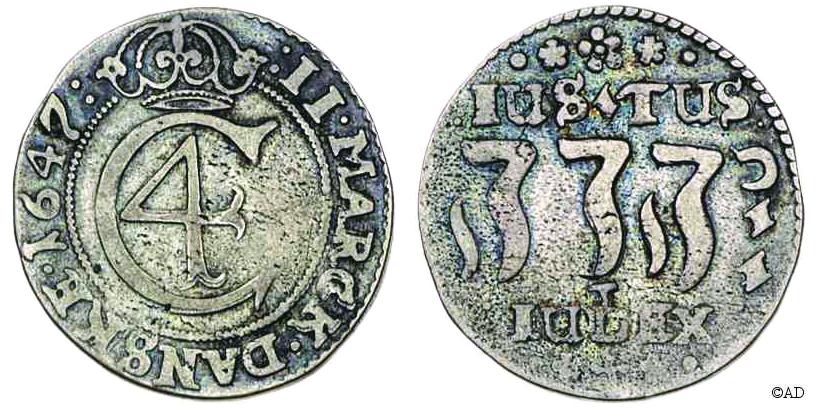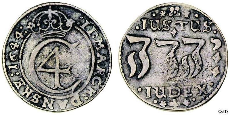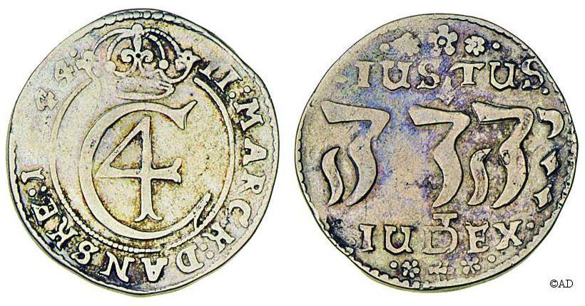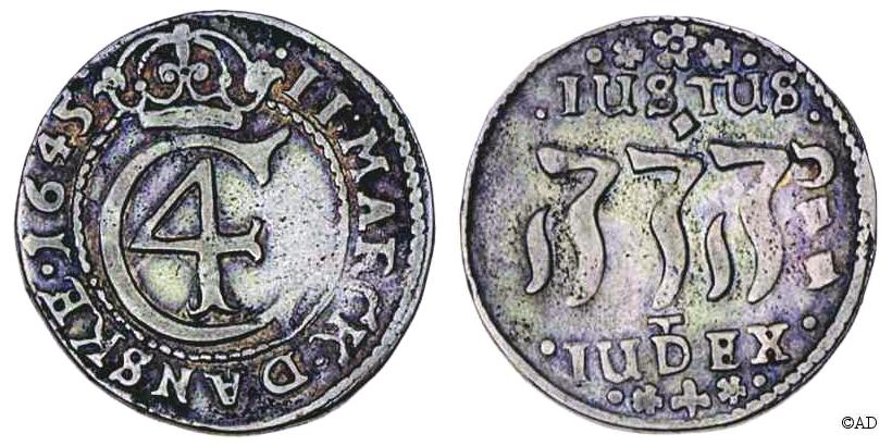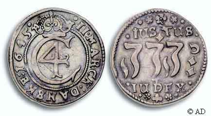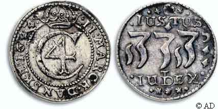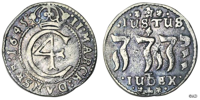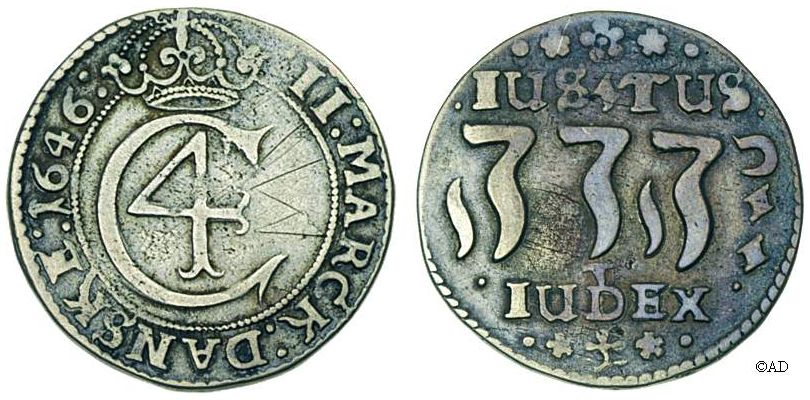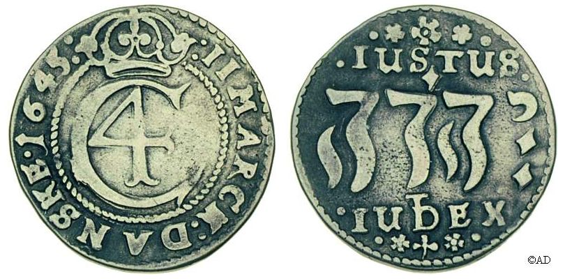 til 28 skilling. Indskriften JUSTUS JEHOVA JUDEX (Herren er en