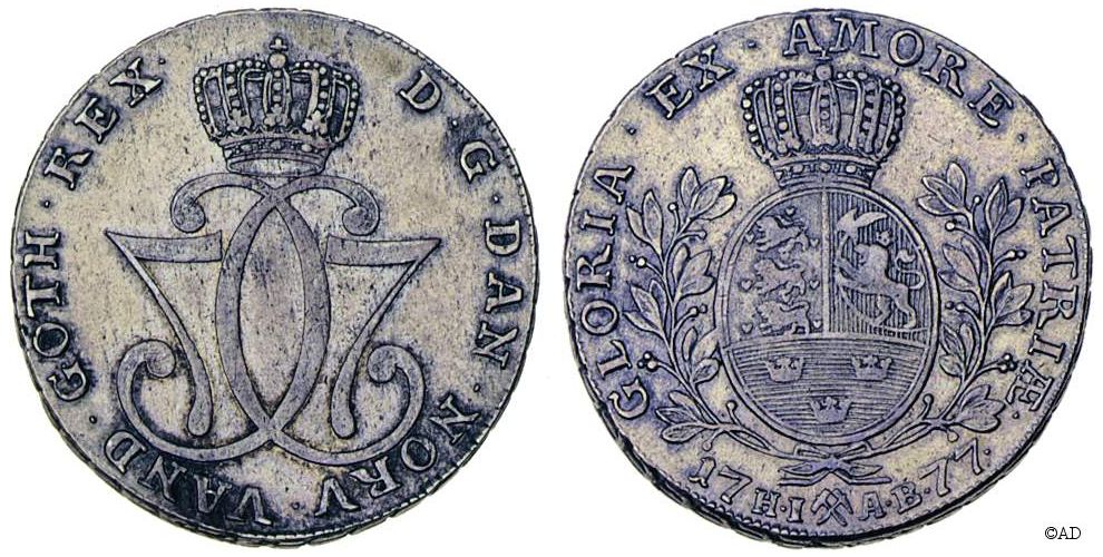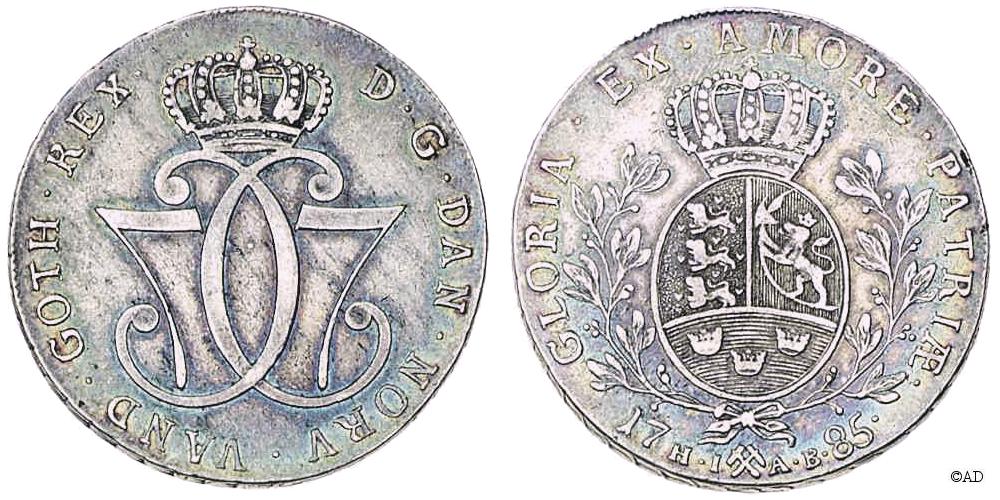 1776, 1777, 1778, 1779, 1781, 1785. Forside: kronet dobbeltmonogram, bagside: danske løver, norske løve, 3 kroner,