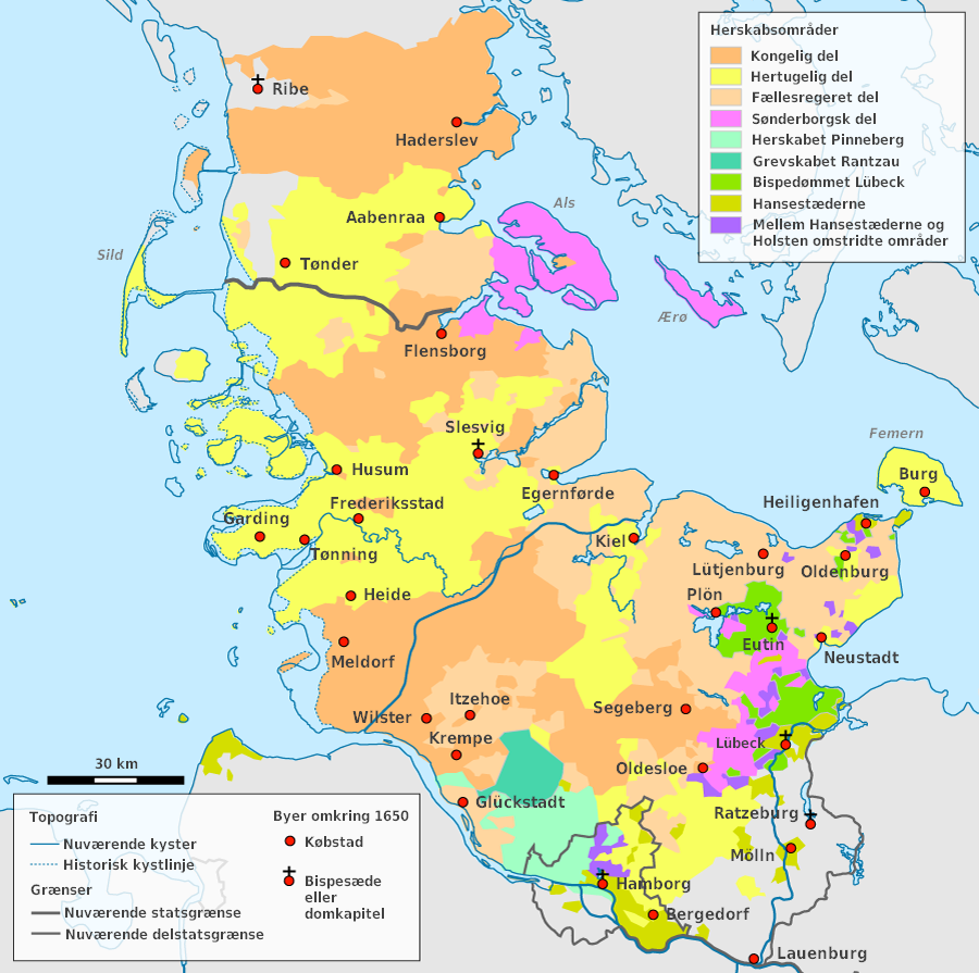 Kort fra ca. 1650 over Slesvig-Holstens opdeling i diverse hertugdømmer og grevskaber. Et sandt kludetæppe.