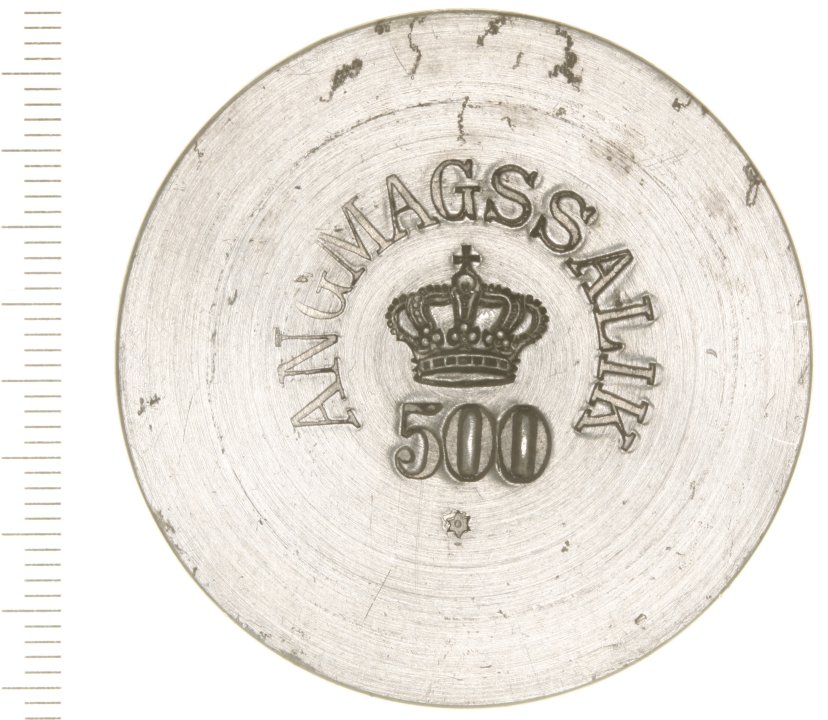 Pengeomløbet i Angmagssalik. 500 med Am på bagsiden, 100, 50 med hul forneden, 25, 10, 5 og 1. Alle af zink og præget i 1894. 500 af aluminium fra 1905.
